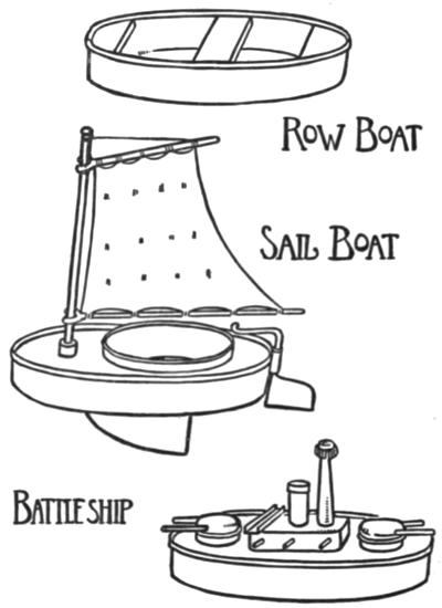 But, better still, working with the tin cans has developed the inventive faculties of my class to a surprising degree. The pupils have thought out and made many models of their own—not only toys but useful things as well. Various members of the class investigated the large trucks, automobiles, hoisting engines, locomotives, boats and such things seen in[3] any water-front community, to see how they were made and how they worked, and why. These pupils then returned to the school shops and made models of their own, many of which showed considerable invention and ingenuity.