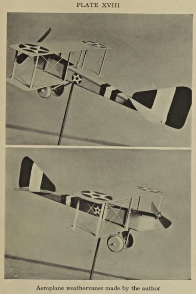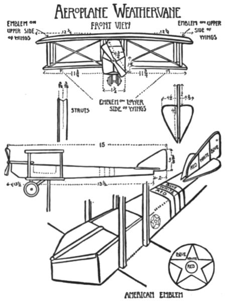 Aeroplane Weathervane.—A biplane weathervane may be made from flat strips of tin. Large round or square cans may be opened out and the tin taken from them used to make the aeroplane weathervane. When this weathervane is mounted on a suitable spike on which it may turn about freely in the wind, the propeller will revolve rapidly when the wind blows.