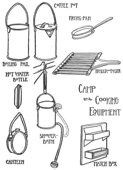 A COFFEE POT—BOILING PAILS—FRYING PAN—TOASTER—A CAMP SHOWER BATH—CANTEEN OR HOT WATER BOTTLE—A MATCH BOX