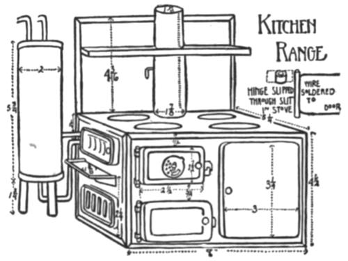 A toy tin can kitchen made by author. The body of the range is made of a biscuit box. The draught door is made of the top of a pepper box, with sifter top. The ash door is made of the bottom of a pepper box. The oven door is made of the hinged tin lid of a little cigar box. The stove lids are made of can lids. The door handles are rivets. The range boiler is made of a long can; pipes are made of wire. The tea kettle is made of a shoe paste box.