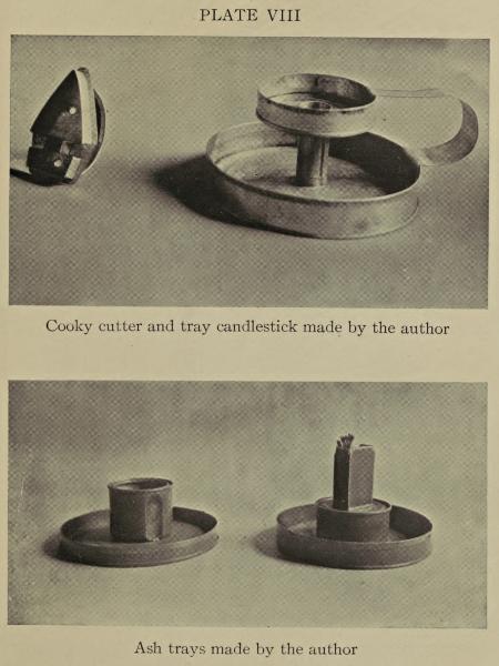 The base of the tall candlestick shown in Fig. 94 is made of various sized cans cut down to tray-like forms and soldered together. As may be seen by studying them, the shafts are made from ordinary tin campaign horns. The drip cups are made of press-in can lids or from small cans cut down to tray-like shapes. All sharp edges are to be turned over. The candle sockets are formed in the same way as that of the candlestick described in Chapter VIII, page 94.