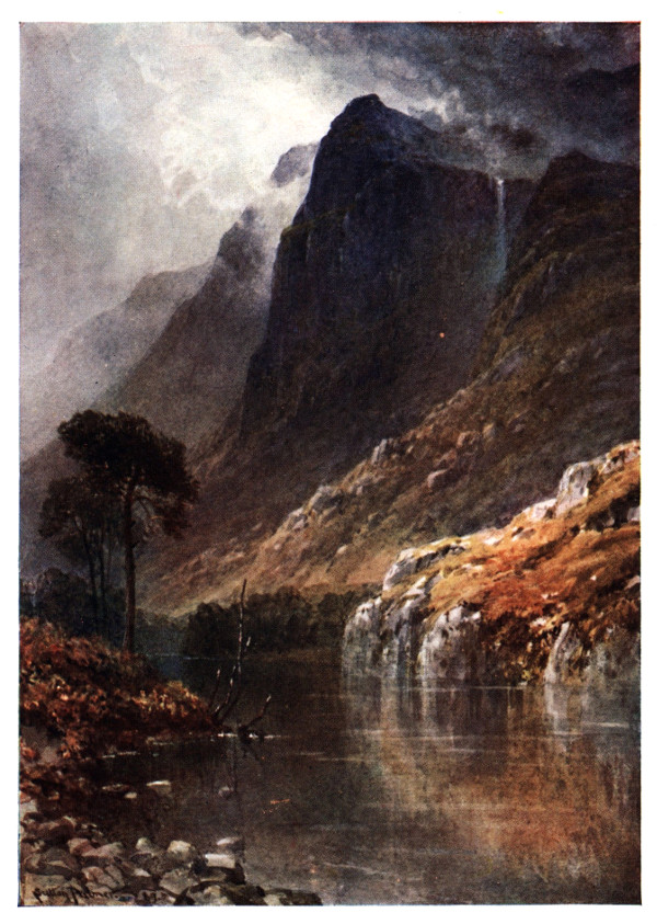 It was when the party had reached a spot where the path rose in zigzags and made its slippery way across the face of a steep slaty cliff that they suddenly discovered they were in an ambuscade under the command of Helen Macgregor herself. The desperate fight that followed, all in favour of the outlaws who commanded the situation; the ludicrous plight of the fat little Bailie, who, caught by the back of the coat on a projecting thorn-bush, swung in mid-air, “where he dangled not unlike the sign of the Golden Fleece over the door of a mercer in the Trongate of his native city”—are not these things writ in the ever-enduring pages of Rob Roy? More awful was the doom of Morris the Gauger, or Exciseman, who was dragged out, condemned as a spy, and drowned by the aid of a large stone bound in a plaid about his neck. “Half naked and thus manacled, they hurled him into the lake, there about twelve feet deep,{35} with a loud halloo of vindictive triumph, above which, however, his last death shriek, the yell of mortal agony, was distinctly heard.”