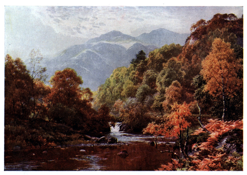 Few more beautiful passes are to be seen than{24} Leny. The dashing stream which runs in a wooded cleft below the road is exactly what one expects a Scottish stream to be. The brown peat-water breaks in cascades over huge grey weather-worn stones, or lies in deep clear pools. The irregularities of its course reveal new beauties at every turn: the dripping green ferns, for ever sprinkled with the spray, hang quivering over the agate depths, and the emerald moss, saturated like a sponge, softens the sharp angles of stones. Tufts of free-growing heather, large as bushes, add colour to the scene, and the slender white stems of the birches rise gracefully amid the gnarled alders and dark-needled firs. The Falls of Leny are reached by a footpath from the road.