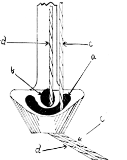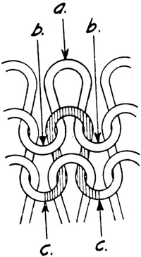 A loop is a very small length of thread, or yarn, taken at some point at a distance from the end and drawn through, or around, some object, usually another loop. Obviously this will result in two loops. One of these coils around the instrument or needle which draws it through and is called the needle loop, shown by the letter a in Fig. 1. The other loops around the object or previous loop through which it was drawn, and is called the sinker loop, indicated by b, b in Fig. 1. These two loops, not two complete loops, but rather one full needle loop and two halves of the sinker loop, make a stitch, as indicated by the shaded portion of Fig. 1 from c to c.