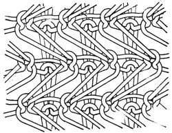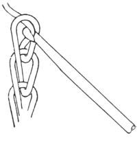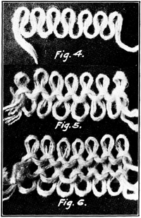 Figs. 10 and 11 show the crochet stitch, which is taken up at this point to show its similarity to the knitted loop and to 14explain the points of difference. The illustrations show very plainly the method of forming crochet loops and they also show that this stitch is simply a single chain or wale of loops succeeding one another.
