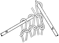 At this point in the building up of the fabric we would slip the previous loop off the left hand needle and let it hang on the newly formed loop on the right hand needle, as in Fig. 9, but as we are not as yet building, but only laying the foundation, we slip this new loop back on the left hand needle, where we now have two loops. The next step is to take the right hand needle, slip it through the second loop, and proceed as with the first, then slip the third loop back on the left hand needle. This procedure is repeated until there are sufficient loops to make the fabric the width wanted. We now have our foundation on which to build.