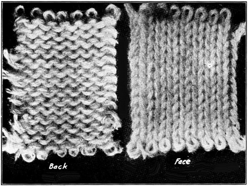 Crosswise of the fabric is the direction in which the yarn feeds while the fabric is in the process of construction, forming loops adjoining one another, or the same direction as the course. Lengthwise of the fabric is the direction in which the fabric is built up by drawing one loop through another, or the same direction as the wale. Therefore the width of the fabric is restricted by the number of loops or needles used as a base, while the length of the fabric has no restrictions other than the supply of material or the will of the knitter. Rib is an alternative expression for wale, but is applicable more particularly where the fabric has a wale on both sides, in which case it is shown as a rib fabric. Where a cloth has a wale on one side only it is known as a jersey fabric, and is also sometimes called flat goods. Rib fabrics will be taken up later for it is my purpose to deal only with jersey or flat fabrics until the theory of knitting is thoroughly explained.