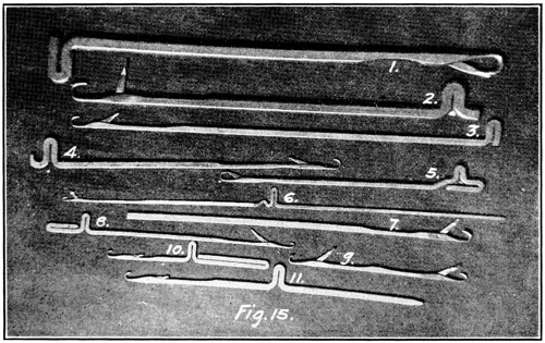 The hook, latch, rivet, cheek, throat and stem are substantially the same except in size in all latch needles, but the balance of the needle may and does vary in shape to a marked degree in the various types and makes of machines. Fig. 15 shows many of the different types of butts and shanks made, as well as the variation in the sizes of the hooks and the thickness of the needles, but it should be understood that the type of the butt and shank has no bearing on the size of the hook and stem, as each type is made in the various sizes and is governed only by the size of the yarn to be used.