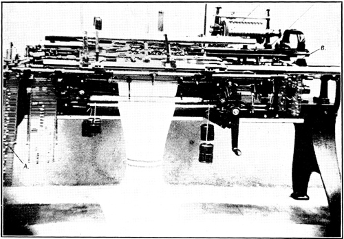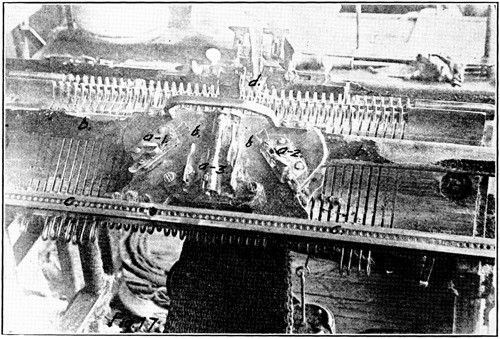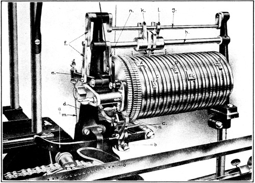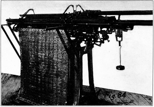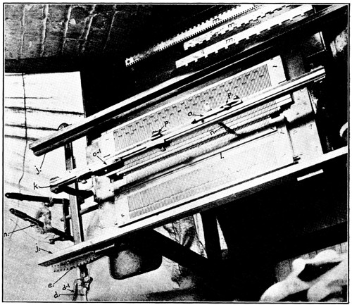 Fig. 84 is a general view of the back of the machine showing a set of cards on the card cylinder ready for work. Fig. 85 shows the mechanism used to bring the cylinder with the cards into action. The cards and cylinder need no distinguishing mark as they should be easily recognized from what has gone before. The same thing applies to the auxiliary needles just above, part of which are turned down to the point where they cannot be put into operation.