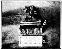 In machine knitting of every kind there must be a needle for every loop, and therein lies the fundamental difference between machine and hand knitting. Latch needles, however, are constructed entirely different from the straight plain hand needles. Fig. 14 shows the construction of the latch needle. It will be noted by looking at the latches on the three needles that they swing freely on a pin or rivet lengthwise of the needle, but have no movement sidewise.