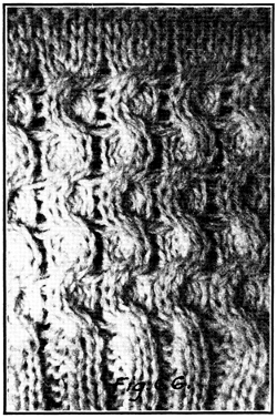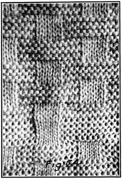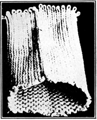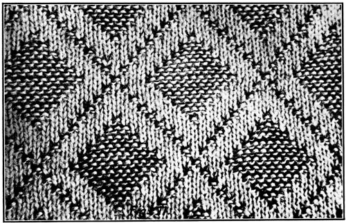 In this fabric the design is brought out on one side only, the back plate, and the needles on the opposite side or front plate are knitting each time the carriage is moved across the machine as explained in detail later. This may be plainly seen in Fig. 87, where the corner is turned over to show the back of the fabric.