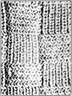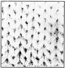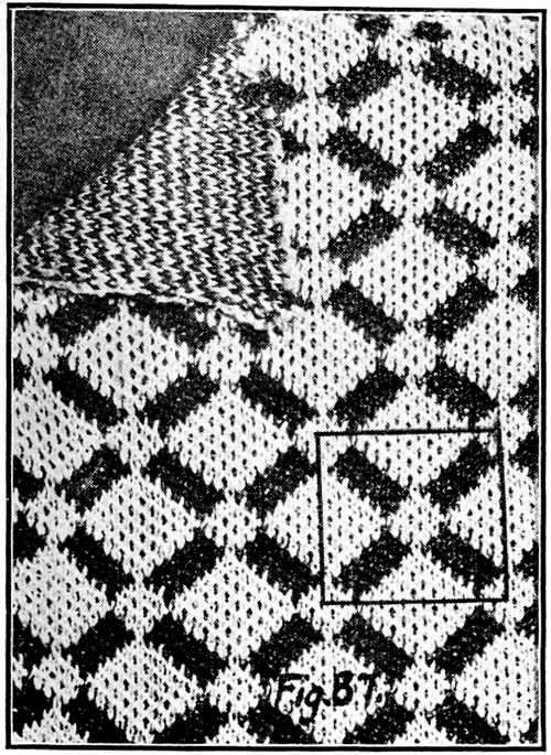 Before going into the mechanical construction of the attachment we will to some extent analyze the fabric to find out what must be done to produce it. Referring to Fig. 87, which is a photographic reproduction of a fabric made on the machine under discussion, it will be noted that both the design and the ground are in solid colors. The rectangular figures which might be called the design are in solid black, while the squares, both the large ones and the small ones, which would be the ground, are solid white. It should be understood that there are two yarn carriers used in making this fabric, one for the white yarn and one for the black, and that these carriers are changed every round; that is, one round of white, and one round of black, alternating throughout the fabric.