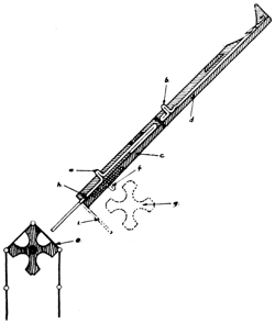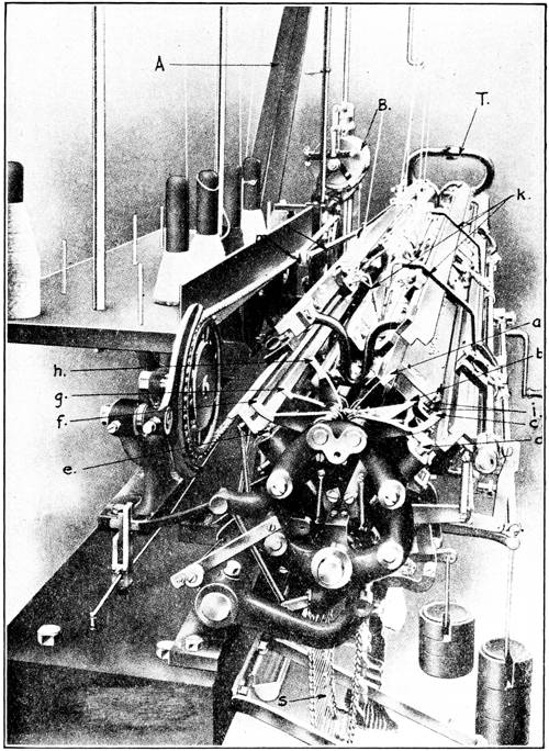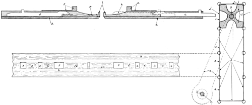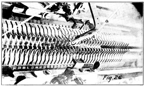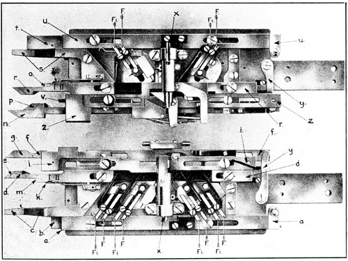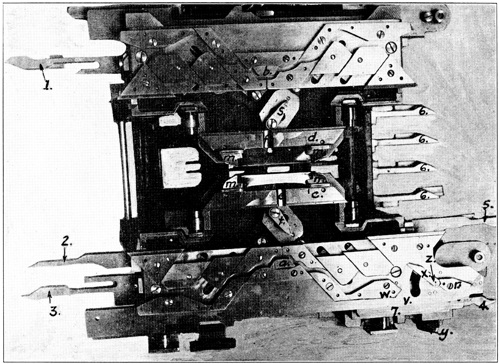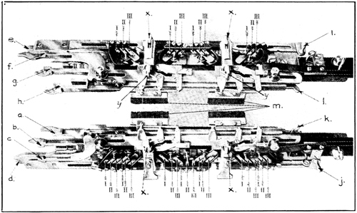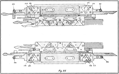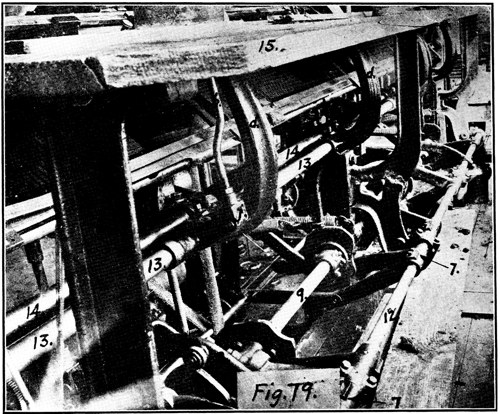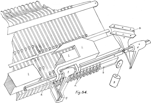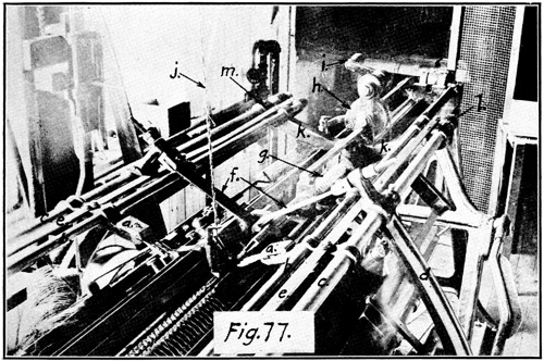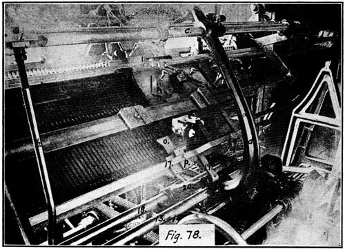 We will refer again to Fig. 77, where we will find two long flat steel straps, one on each side of the machine, marked e and e. It will be noted that these straps are attached securely to the yokes that carry the deckers, as well as to the crossheads or bridges marked l and m. Reaching across from one to the other and attached to these bridges is a yoke the two arms of which are indicated by k and k. These two arms come together at the center in a hub through which runs the worm or screw indicated by g.
