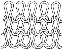In the knitted fabric the loops are laid side by side and there are a sufficient number of loops being used at all times to make the width of fabric desired. The wales are bound together by the yarn passing from one loop to the next adjoining one, thereby forming the sinker loops which have already been explained.