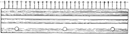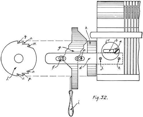 Fig. 90 shows the auxiliary needles in position with the card cylinder and cards in place ready to push them up into operation. Those needles which it is desired not to operate at all, such as the needles at the end of the plate that may not be needed, are drawn down and the ends are turned down to the point where they are at right angles to the plate, as shown by the dotted line at i. When they are in this position the cards cannot of course push them up into operating position. The short nib that looks like a part of a needle, indicated at f, and the card cylinder shown at g are not a part of the mechanism under consideration, but are another method of needle selection which will be explained later.