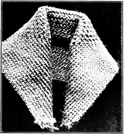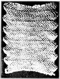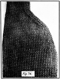 The fabric photograph shown in Fig. 74 is part of a storm collar made for a Shaker sweater. The wide part is that part of the collar that covers from the top of the shoulder down to where the narrowing stops at the center of the breast. The narrow strip is a part of the border on the front opening upon which is placed the buttons and button-holes. It is narrowed down five needles, with four rounds between in the first part, 128while the last part has nine narrowings with one round between.