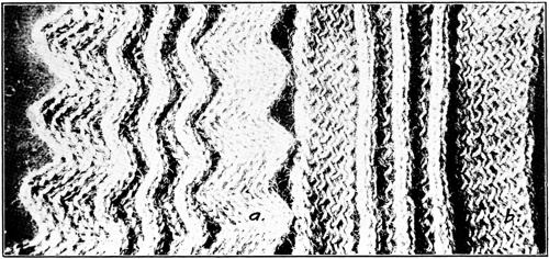 This first course of stitches, it should be noted, has the needle loop only, the sinker loop being tied in to form a base or edge from which to start. Fig. 7 shows the first position to form the loops with two needles. One full course is on the needle lettered a, while needle b is thrust through the first loop of the last course and receiving yarn to draw through a new loop.
