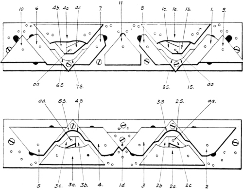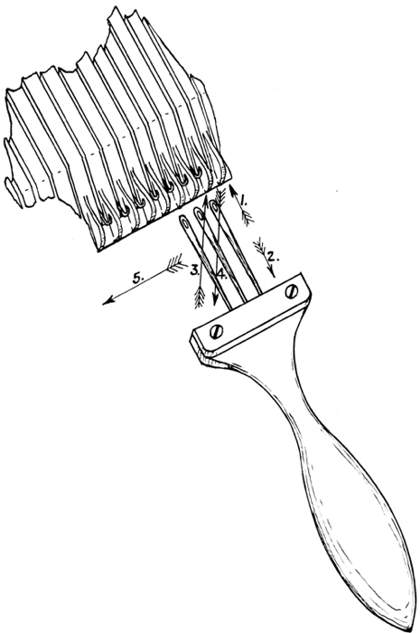 It will be remembered that in narrowing by hand there were three lines of movement of the decker or narrowing comb. But lines of movement should not be confused with direction of movement. An object may be moved in one line, but if moved back and forth on that line it would move in two directions.