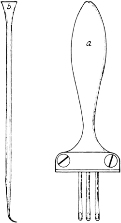 We will take up the manner of mounting the deckers and the auxiliary parts through the medium of which the narrowing is done. Referring to Fig. 77, the decker points may be seen at a, a, mounted in a clamp in much the same manner as the hand deckers were mounted. The decker points, however, are somewhat different from those used in the hand decker, these latter being solid, either flat or round, while those on the automatic machine are half-round or U-shaped, as shown in Fig. 76, to facilitate placing them on the hooks of the needles.