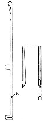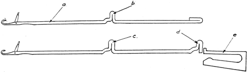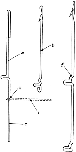 Now to show how the needles are selected we will first refer to Fig. 89, which shows the needle proper at b and the auxiliary needle at a. The auxiliary needle has a joint in it as shown at h to permit the lower end e to swing to the position shown by the dotted line i.