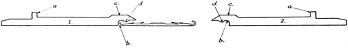 These two plates are in perfect alignment, both as to the surface and the needle tricks or slots. In the double jacquard the front plate would be in two parts and a duplicate of the back plate, but in the single jacquard the front side would have what is the upper plate on the back side only, and would use the short needles as shown at b, Fig. 89.