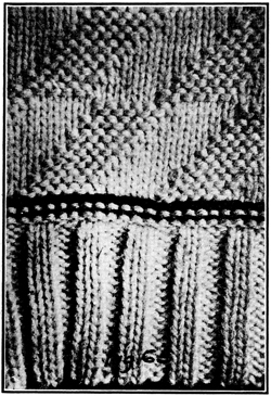 To break them up into checks or squares we would at this point have to either skip racking once while continuing the change of carriers each round, or miss changing carriers once while continuing the rack of four needles each round. This change must of course be made every four rounds throughout the length of the fabric, or as long as it is desired to make the check. It should be remembered that it is the auxiliary plate that is racked in this case, and not the needles proper; therefore the rack does not show in the fabric. But the shifting of these alternate sets of four auxiliary needles each round causes alternate groups of four of the needles proper to knit, the set which knits depending on which way the auxiliary plate is racked.