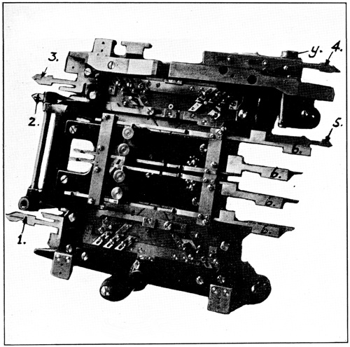 This lever has the proper movements imparted to it through the pin and roller, which may be plainly seen, resting on the periphery of an irregular cam, just the same as has been explained for lever 1 for the first movement, except that the pin and roller rest on the top of the cam in this instance, while in the former case the pin and roller were held firmly up against the bottom of the cam by a coil spring.