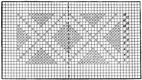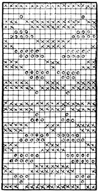 As may be seen in Fig. 88, it would take 36 cards to make this design. In cutting the cards for this we would cut out the places shown blank and leave the card whole to push the needles into operation in the places marked by an x or an o. This cutting would of course have to be repeated the width of the fabric, or the length of each card.