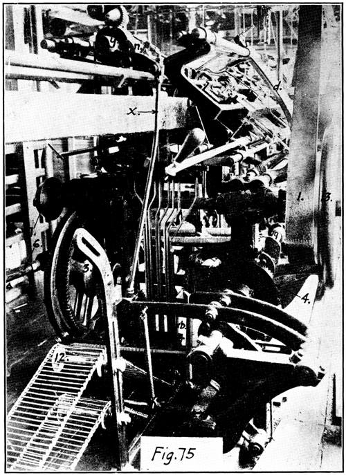 The several vertical straps which may be seen at or near the center of Fig. 75 are the mediums through which the automatic changes are made by studs coming under and raising them. These studs are attached in their several positions on the chain 12. We will not go into these further, for while the construction is somewhat different from what we have had, the principle is the same. As the studs on the chain come under the straps, they raise them up and this moves a stop in the path of the different slides which changes the locks, yarn carriers, etc.