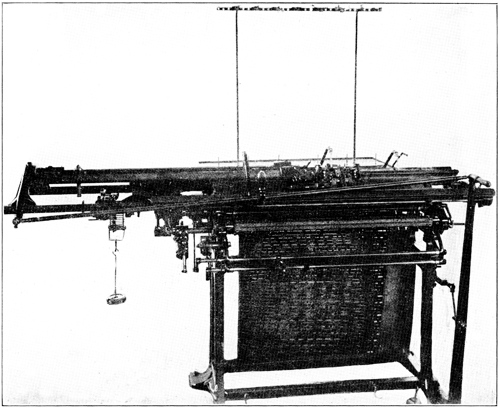 So far as the knitting mechanism is concerned, the flat jacquard machine is designed and constructed along the same lines as the ordinary flat machine, with the card cylinder for cards and the other necessary appurtenances added. Fig. 83 is a general view of a Dubied jacquard machine, which is semi-automatic but operated by hand. This illustration and the other photographs for this chapter were secured through the courtesy of D. Nusbaum & Co.