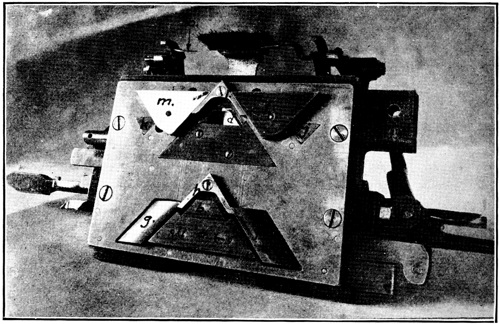 This same check design may be made with one card properly cut by preventing the card cylinder from turning and racking, or moving the card cylinder back and forth four needles in the same manner as the auxiliary plate was moved. Or it may be made with four cards without moving either the plate or card cylinder. In this case it would be necessary to use all the auxiliary needles and lower the wing cams f and g, Fig. 86, into action.