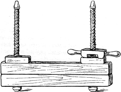 Sind alle Druckbogen planiert, so werden sie durch Auspressen von dem überflüssigen Wasser befreit. Nachdem man oben und unten abgängige Papiere zum Schutze vorgelegt hat, bringt man die feuchten Bogen auf das sogenannte Planierbrett. Dies ist ein starkes Brett, welches ringsumher mit Leisten versehen ist, die den Zweck haben, das wiederholt naß werdende Brett gegen das Ziehen zu schützen, und dazu dienen, das beim Pressen heraustretende Wasser zu sammeln, das dann an einer hierfür bestimmten Öffnung abgelassen wird. Das Brett hat eine Größe von etwa 40 zu 60 cm. Das Auspressen des Wassers geschieht mittels der Stock- oder Handpresse. Seit ältester Zeit, solange man überhaupt die Arbeit des Pressens verfolgen kann, kennt man die große Stockpresse genau[9] in der Anordnung, wie sie zum Keltern benützt wurde, und die kleinere Handpresse. Erstere besteht aus zwei starken Brettern die mittelst einer Hebelstange zusammengepreßt werden. Die Handpresse besteht aus zwei Pressbalken, die vermittelst Muttern, welche auf Spindeln drehbar sind, zusammengeschraubt werden. (Fig. 4.) Zu der Handpresse gehört dann noch der Pressbengel, eine Handhabe zum Anziehen oder zum Öffnen der Muttern.