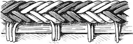 Den Übergang von diesen weichen Bänden, welche bis ins[5] 15. Jahrhundert hinein üblich waren, zu den späteren, mit seitlich überstehenden Holzdeckeln versehenen, bezeichnet eine Art Schutzdecke, die noch in vielen Beispielen aus dem 15. Jahrhundert erhalten ist. Der Band ist auf Lederbünde geheftet, an denen vorher mit Leder eingefaßte Deckel befestigt sind. Der äußere Lederbezug ist jedoch nicht nach innen eingeschlagen, sondern steht nach allen Richtungen soweit über, daß er die Bogenränder — Schnitt darf man wohl noch nicht sagen — völlig deckte. Zur besseren Befestigung ist er an den eingefaßten Kanten festgenäht (Fig. 2).