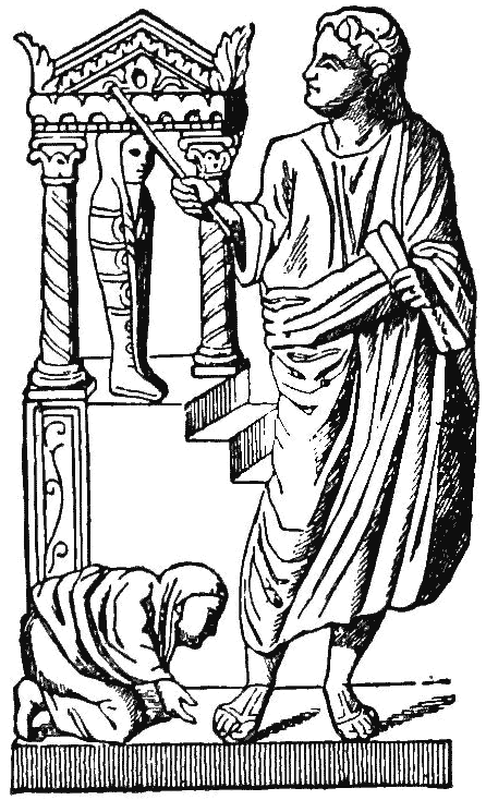 The adjoined illustration, one of the oldest representations of Christ, has been reproduced from Rossi’s Roma Sotterranea (II, Table 14). It is a fresco of the catacombs, discovered in the St. Callisto Chapel, and is dated by Franz Xaver Kraus (Geschichte der christlichen Kunst, I, p. 153) at the beginning of the third century. Jesus holds in his left hand the scriptures, while his right hand grasps the wand with which he performs the miracle. Lazarus is represented as a mummy, while one of his sisters kneels at the Saviour’s feet.