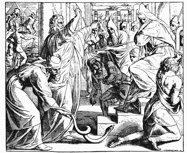 We read in the Bible that when the Lord “multiplied his signs” in Egypt, he sent Moses and Aaron to Pharaoh to turn their rods into serpents, that the Egyptian magicians vied with them in the performance, but that Aaron’s rod swallowed up their rods, demonstrating thus Aaron’s superiority. It is an interesting fact that the snake charmers of Egypt perform to-day a similar feat, which consists in paralyzing a snake so as to render it motionless. The snake then looks like a stick, but is not rigid. {xi}