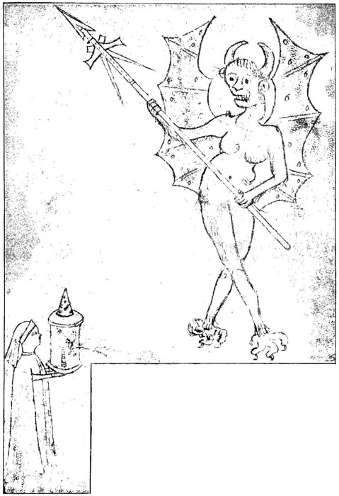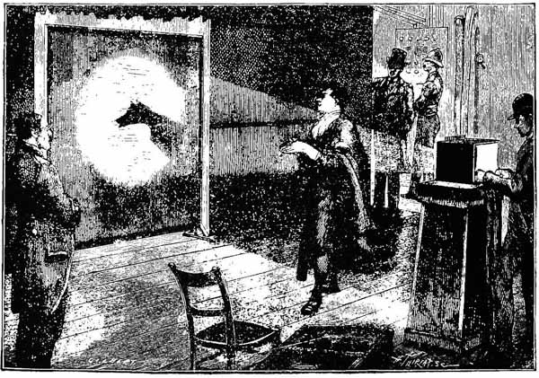 Fontana’s lantern was used, as F. M. Feldhaus informs us (Gartenlaube, 1905, Nov. 23, p. 848) by the encignerius or antwere maister, i. e., the master of siege and fortress defenses, who from an appropriate hiding-place projected the image upon a convenient wall in the outside works of a fort so as to let assailants unexpectedly be confronted with the hideous form of a demon.]