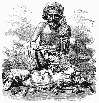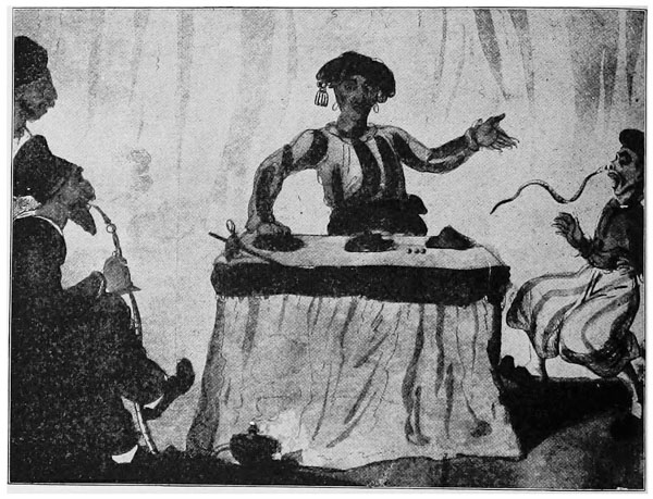 (After Carl Willmann.)“The juggler, with a big bag of properties, arrived on the scene and immediately began to talk excitedly, meanwhile unpacking various receptacles taken from the bag. He squatted down, piped a few notes on a wheezy reed whistle and the show began. From his belongings he took a little tin can about the size of a cove oyster can, filled it with dirt and saturated the dirt with water. Then he held up a mango seed to show that there was nothing concealed by his sleeves; counted ‘ek, do, tin, char,’ or ‘one, two, three, four,’ and imbedded the seed in the moist earth. He spread a large cloth over the can and several feet of circumjacent ground. Then he played a few more notes on his reed instrument and allowed the seed a few minutes in which to take root and develop into a glorious shade tree. While he was waiting he {xxix} unfolded some snakes from a small basket, took a mongoose from a bag and entertained his audience with a combat between the mongoose and one of the snakes.
