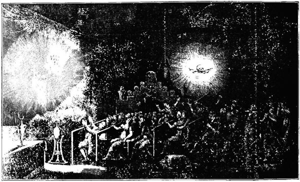 The magic lantern, commonly supposed to be an invention of the Jesuit Kircher, in 1671, must have been secretly known among the few members of the craft of scientific magic at least as early as the end of the middle ages, for we have an old drawing, which is here reproduced, showing that it was employed in warfare as a means of striking terror in the ranks of the enemy. We have no information as to the success of the stratagem, but we may assume that in the days of a common belief in witchcraft and absolute ignorance of the natural sciences, it must have been quite effective with superstitious soldiers {xvii}
