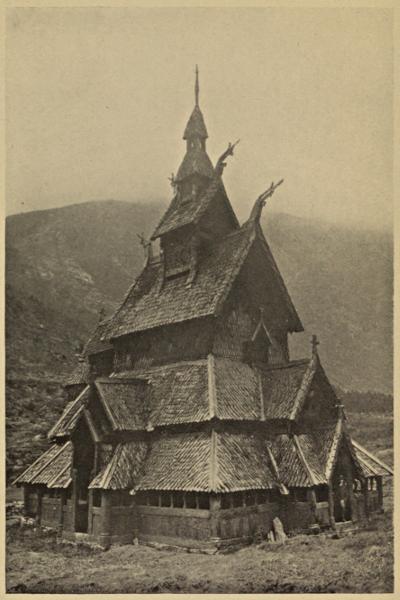 The finest example of a medieval stave-kirke is at Borgund in the Valdres district. It is built of logs of timber and the roof is arranged in several tiers like a pagoda. The walls are shingled with pieces of wood cut into the shape of the scales of a fish, and the many pinnacles[315] and gables are surmounted by the most curious wooden gargoyle dragons, pointing their tongues skyward.