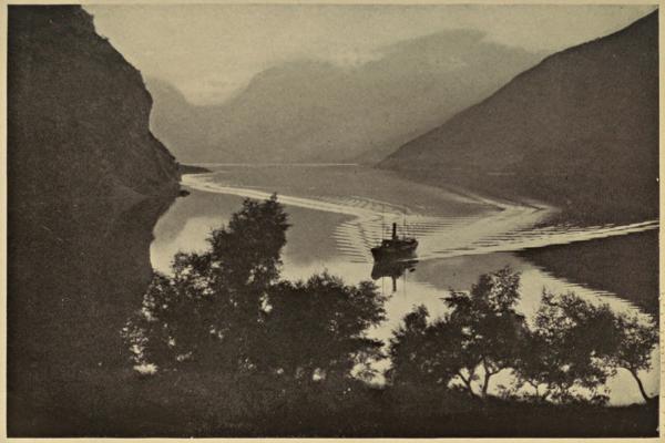 Our little steamer Lodölen is rather a curiosity, for its engine was taken from the wreck of a former ship. Some years ago the Lodölen’s predecessor was quietly making its way along the eastern end of the lake when without warning a whole mountain, or at least a large part of a mountain, tumbled bodily into the lake. A tidal wave was created which caught the steamer and carried it far[300] up the mountain side. To-day, from the deck of the Lodölen, we can see the wreck of the old ship whose engine is propelling the new. Perhaps the guardians of the lake rebelled at the indignity of having a steamer invade its quietness, and took this means of showing their displeasure; but persistent humanity seems to be unwilling to be thwarted. Perhaps some day the Lodölen will meet with a similar fate and another steamer take its place.