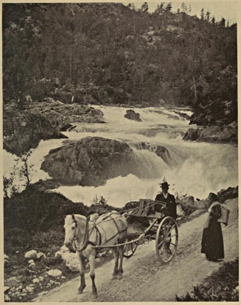 Farther down the Telemark route from Ulefos there is a fine excursion up the Saur River and the Nordsjö to Notodden and the Rjukan Falls. This Saur River is erroneously called the “Norwegian Rhine.” The Rhine should be called the “Swiss-German-Dutch Saur,” for I maintain that Norway is the fatherland of[313] natural scenery, and the mere fact that the Rhine is situated within easy access of all Europe does not justify the implication that it is the last word in river scenery and that the Saur is rather a poor, second-rate, Norwegian imitation of it.