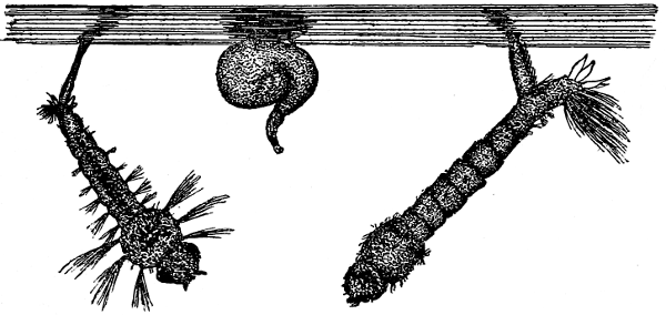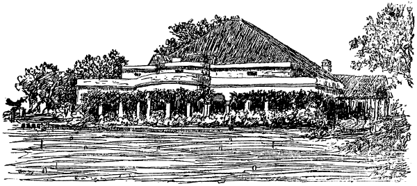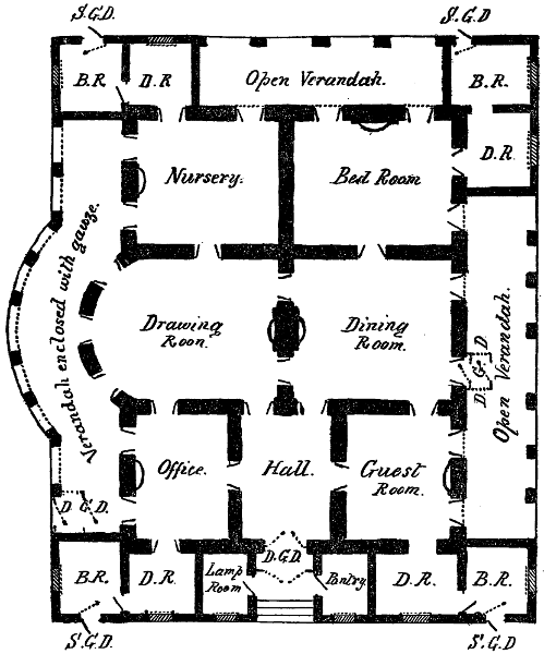 It must not of course be forgotten, that the provision of a free supply of good vegetables is everywhere an essential to health, and is in many localities obtainable in no other way than by the maintenance of a garden, and that under such circumstances, it is probably safest to keep their cultivation under personal supervision; but where such an accessory is indispensable, its attendant dangers should always be carefully borne in mind, and care should be taken that the garden should be so worked as to avoid its becoming a breeding place for mosquitoes. A house for example, such as that shown in the subjoined sketch, makes, doubtless, a very inviting picture, but when lived in, it would be found that the fine trees almost completely cut off the breeze, that the beautiful creepers render the verandahs and the rooms behind them “stuffy,” and that the wealth of vegetation, combined with the arrangements for irrigation, render it a veritable paradise of mosquitoes.
