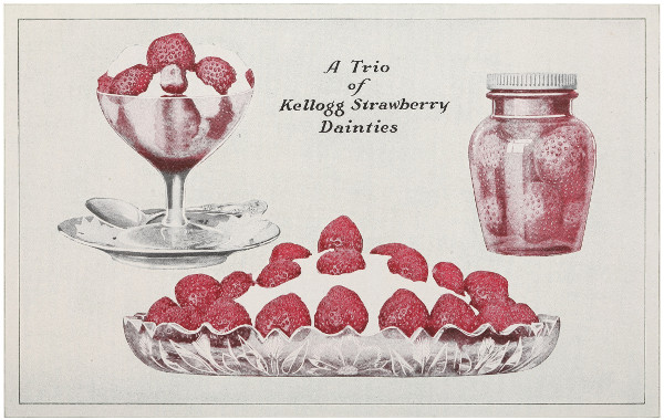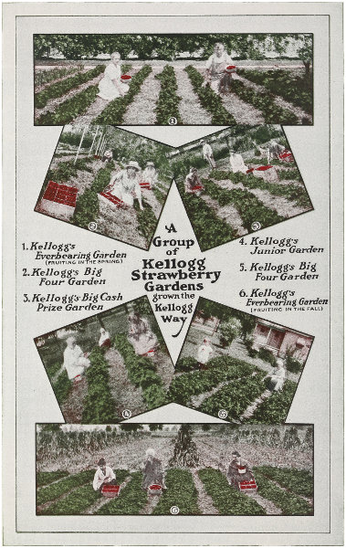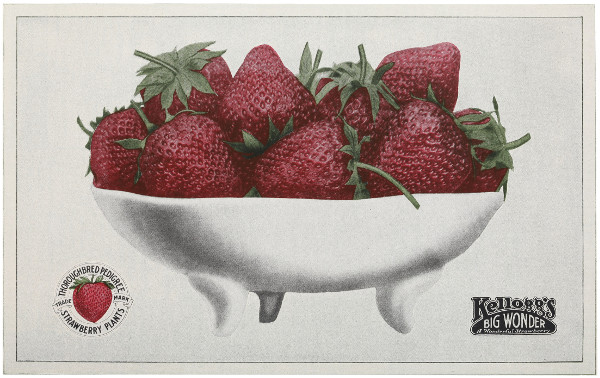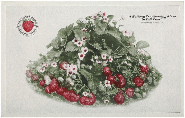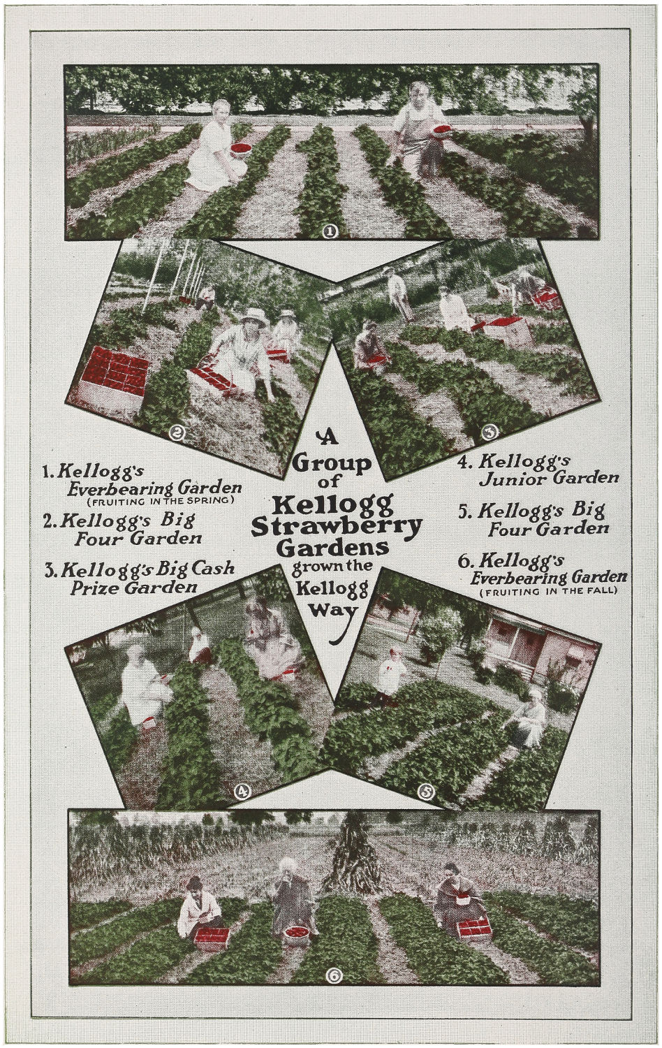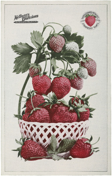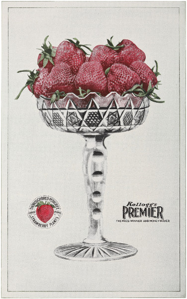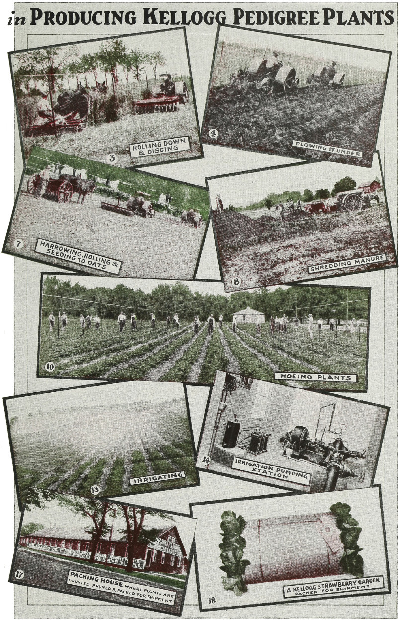 Gray captions under illustrations are transcriptions of the text within the illustration. The Kellogg Trade Mark illustration (“THOROUGHBRED PEDIGREE--TRADE MARK--STRAWBERRY PLANTS”) occurs in many illustrations, but has been transcribed just once (on the front page).