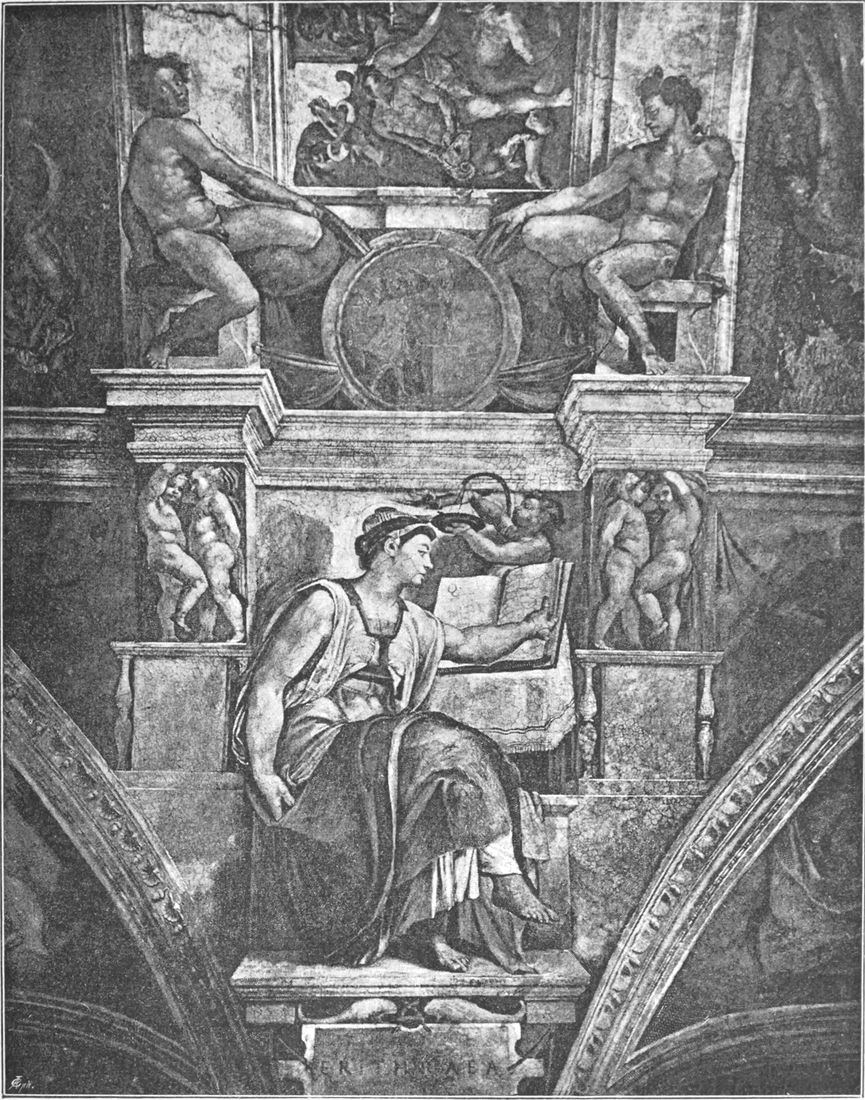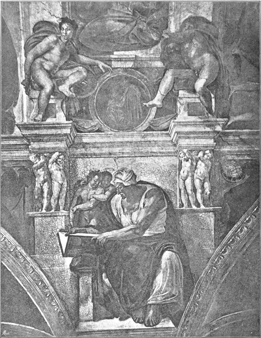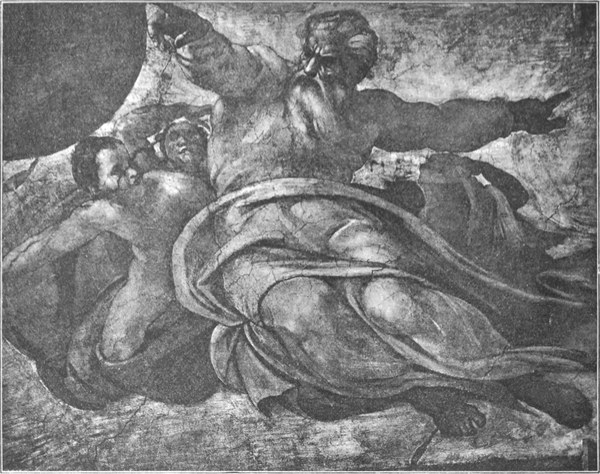 So ist der großartige Inhalt, den Michelangelo den Deckenmalereien gegeben hat, sein ureigenster Gedanke. Er stellte die Vorgeschichte der Erlösung dar: die Schöpfung und den Sündenfall und das weitere Versinken der Menschheit in Sünde; dazu das Hoffen auf den Erlöser, die Vorherverkündigung seiner Ankunft und Vorbedeutungen der Erlösung.