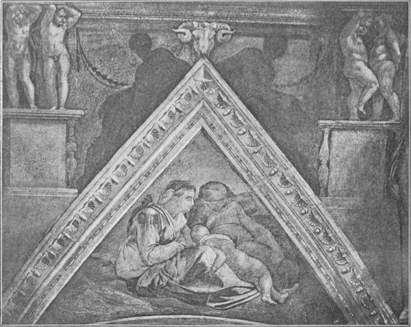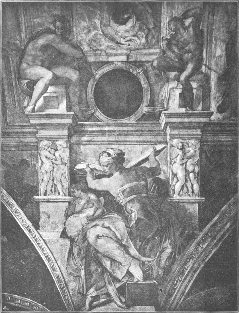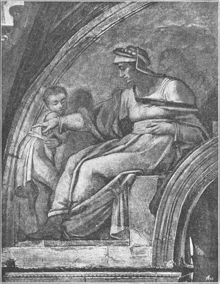 Michelangelo hoffte noch immer auf die Ausführung des Grabmals. Aber vergebens; der Papst bestand unerbittlich auf dem Ausmalen der Decke in der Sixtinischen Kapelle, und dieses Mal beugte sich der Künstler dem eisernen Willen des Herrschers. Mit blutendem Herzen begann er ein Werk, das für ihn den Verzicht auf die Erfüllung seines stolzesten Künstlertraumes bedeutete, und er schuf in diesem Werk das Herrlichste, was die Monumentalmalerei überhaupt hervorgebracht hat, eine Schöpfung so schön und gewaltig, daß die Nachwelt wohl das Recht hat zu glauben, der Meister habe sich hierdurch ein größeres Anrecht auf ihren Dank erworben, als wenn er jenes Riesengrabmal zur Ausführung gebracht hätte.