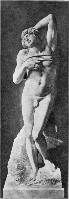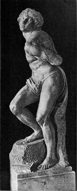Die überflüssig gewordenen Figuren der beiden Gefangenen schenkte Michelangelo dem in Lyon ansässigen Florentiner Roberto Strozzi, in dessen römischem Hause er im Jahre 1544 während einer schweren Krankheit gepflegt wurde. Dieselben kamen dann in den Besitz des Connetable Anne de Montmorency; vom letzten Montmorency wurden sie dem Kardinal Richelieu geschenkt, und sie blieben im Besitz der Familie Richelieu, bis sie gegen Ende des vorigen Jahrhunderts für den französischen Staat erworben wurden. — Es ist erwähnenswert, daß Michelangelo an Roberto Strozzi die Bitte richtete, dem König von Frankreich zu sagen, daß er, Michelangelo, auf seine eigenen Kosten dem König ein ehernes Reiterstandbild auf dem Hauptplatz von Florenz errichten wollte, wenn derselbe Florenz die Freiheit wieder verschaffte. Michelangelo glühte für die Freiheit seiner Heimat, die doch als endgültig verloren gelten mußte, seit Alessandros Nachfolger, der junge und thatkräftige Cosimo, das Haupt der jüngeren Linie der Mediceer, die Stadt und ihr Gebiet als ein erbliches Herzogtum beherrschte. In jener Zeit mag der Meister die trotz ihres unfertigen Zustandes so wunderbar ausdrucksvolle Büste des Freiheitshelden Brutus gemeißelt haben, die sich im Nationalmuseum zu Florenz befindet.