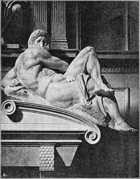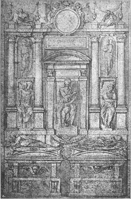 Vor Ablauf des Jahres 1530 war Michelangelo wieder eifrig bei der Arbeit in der Grabkapelle der Medici, und er blieb während der nächsten Jahre bei diesem Werk. Aber er arbeitete unter der größten körperlichen und geistigen Qual. Er war, wie[S. 74] ein Freund am 29. September 1531 über ihn berichtet, bis zur Fleischlosigkeit abgemagert. „Michelangelo wird,“ heißt es in demselben Bericht weiter, „nicht mehr lange leben, wenn nicht Abhilfe geschafft wird; denn er arbeitet viel, ißt wenig und schlecht und schläft auch nicht, und seit einem Monat wird er stark behindert durch Kopfschmerzen und Schwindel; er hat, kurz gesagt, zwei Übel, eines am Kopf und eines am Herzen, und für jedes gibt es ein Heilmittel, man muß nur die Ursache wissen und aussprechen.“ Das Heilmittel für den Kopf sollte darin bestehen, daß dem Meister verboten würde, während des Winters in der feuchten und kalten Kapelle, wo er sich den Tod hole, zu arbeiten; das Heilmittel für das Herz sollte in der endlichen Regelung der Sache des Juliusgrabmals bestehen; denn um dieser Sache willen war Michelangelo ganz in Schwermut verfallen.