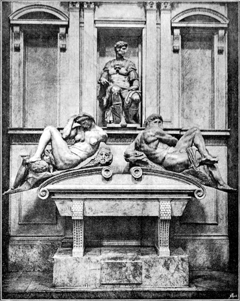 Es ist ein mannigfaltig bewegtes, düsteres Stück Lebensgeschichte, welches den Hintergrund der gewaltigen Schöpfung Michelangelos bildet, die, obgleich unvollendet, für sich allein genügen würde, ebensogut wie die Decke der Sixtinischen Kapelle, ihm für alle Zeiten und über allen Wechsel des Geschmacks hinaus unvergänglichen Ruhm zu sichern. Der Eindruck, den die Grabkapelle der Mediceer als Ganzes, in ihrer Einheit von Baukunst und Bildhauerkunst, bei dem von oben her nach allen Seiten hin gleichmäßig einfallenden Licht, auf den Beschauer ausübt, läßt sich nicht schildern; man kann ihn nur an Ort und Stelle empfinden. An jedem der beiden Grabmäler, welche die Seitenwände einnehmen, befinden sich nur drei Figuren: das sitzende Bild der hier bestatteten Persönlichkeit in der mittelsten Nische des unteren Wandgeschosses und zwei allegorische Gestalten, welche auf dem Deckel des vor der Wand stehenden Sarkophags ruhen. Diese drei Figuren wirken so mächtig, daß sie die Leere der vielen unausgefüllt gebliebenen Nischen vergessen lassen. An der Wand gegenüber dem Altar befindet sich als siebente Figur von Michelangelos Hand eine Madonna; zu ihren Seiten wurden nachträglich die nach den Entwürfen des Meisters von seinen Gehilfen ausgeführten Figuren der beiden Schutzheiligen des Mediceischen Hauses, Cosmas und Damian, aufgestellt.