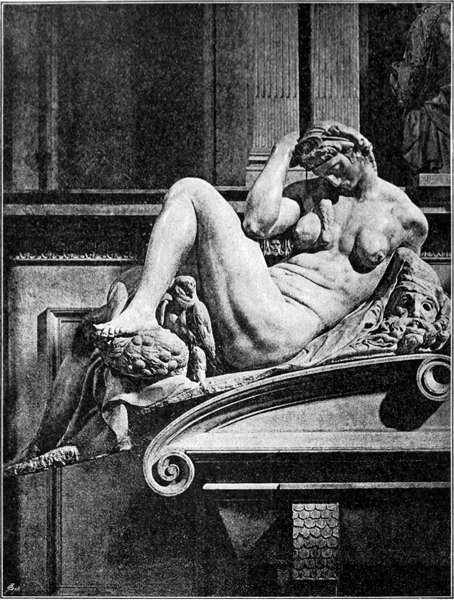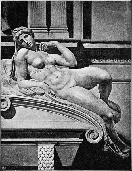 Auf dem Sarkophag zu Füßen Giulianos ruhen die allegorischen Gestalten des Tages und der Nacht (Abb. 59 u. 60), auf dem Sarkophag Lorenzos diejenigen des Abends und der Morgenröte (Abb. 61 u. 62). Diese vier Figuren befanden sich im Jahre 1526 sämtlich schon in Arbeit. Sie waren angefangen worden, als noch die Absicht bestand, daß jede Figur für sich auf einem Sarkophag lagern sollte (vgl. Abb. 51); daher kommt es, daß sie bei der später beschlossenen Aufstellung, zu je zweien auf einem Sarkophag, mit den Füßen keinen Platz mehr auf dem Sargdeckel gefunden haben. Was Michelangelo mit diesen Gestalten, zu denen noch mehrere von verwandter Art hinzukommen sollten, sagen wollte, darüber geben einige Worte Auskunft, die er selbst auf der Rückseite einer Zeichnung aufgeschrieben hat: „Der Tag und die Nacht sprechen und sagen: wir haben mit unserem schnellen Lauf den Herzog Giuliano zum Tode geführt; es ist wohl billig, daß er sich dafür rächt, wie er thut; und die Rache ist diese: wie wir ihn getötet haben, so hat der Tote uns das Licht genommen, und mit dem Schließen seiner Augen hat er die unsrigen zugedrückt, daß sie nicht mehr leuchten über der Erde. Was hätte er wohl mit uns gemacht, wenn er am Leben blieb!“ Die zuerst vollendete von den vier mächtigen, übermenschlichen Gestalten, die einzige, welche ganz fertig geworden, ist die Nacht. Die Mutter von Schlaf und Tod, der zur Kennzeichnung eine tragische Maske, eine Eule und ein Bündel Mohnköpfe beigegeben sind, erscheint als eine kräftig-schlanke Riesin von mütterlicher Bildung; sie schläft, aber im Schlaf[S. 80] verfolgt sie der Schmerz. Einst fand man unter dieser Gestalt einen Zettel angeheftet, auf dem die Bewunderung ihrer Lebensfülle mit einem gewandten Hinweis auf Michelangelos Namen, in einer Vierzeile ausgesprochen war: