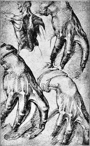 Ein Angehöriger einer Nebenlinie des Mediceerhauses, Lorenzo di Pierfrancesco (d. h. Pierfrancescos Sohn), hatte in Florenz verbleiben dürfen. Für diesen führte Michelangelo einen „Giovannino“ (Johannes der Täufer als Knabe) in Marmor aus. Der Giovannino war jahrhundertelang verschollen, er scheint wieder gefunden zu sein in einer jetzt im Berliner Museum befindlichen Figur, welche Johannes als einen halbwüchsigen Knaben darstellt, der im Begriff ist, den aus einer Honigwabe in ein Ziegenhorn geträufelten Honig zu kosten (Abb. 5). Diese merkwürdige Figur weist in ihrer ganzen Erscheinung auf zwei verschiedene Quellen hin, aus denen ihr Urheber Belehrung geschöpft hat: teilweise, besonders im Kopf, läßt sie jenen strengen Realismus erkennen, der für das XV. Jahrhundert bezeichnend ist, und teilweise bekundet sie ein verständnisvolles Studium der idealen Gebilde der antiken Kunst. In seinem nächsten Marmorwerk, einem schlafenden Liebesgott, folgte Michelangelo ganz dem Vorbild der Antike, und dies gelang ihm so gut, daß Lorenzo di Pierfrancesco ihm riet, er solle der Figur künstlich ein altes Aussehen geben, dann könnte er sie in Rom als antik verkaufen. Ein geschäftskluger Zwischenhändler machte sich diesen Gedanken zunutze, brachte den Liebesgott nach Rom und verkaufte ihn dem Kardinal Riario als eine eben ausgegrabene Antike; nicht zufrieden damit, den Käufer betrogen zu haben, betrog er auch den Künstler, indem er ihm von 200 Dukaten, die er bekommen, nur 30 auszahlen ließ. Als der Kardinal durch einen Boten, den er nach Florenz schickte, um über die Herkunft der Figur Erkundigungen einzuziehen, von Michelangelo erfuhr, daß dieser der Schöpfer des schlafenden Cupido sei, machte er aus Verdruß darüber, daß er sich hatte täuschen lassen, den Handel rückgängig; zugleich aber gab er Veranlassung, daß Michelangelo nach Rom übersiedelte. Es wird erzählt, der kunstverständige Bote Riarios habe sich von der hohen Meister[S. 8]schaft Michelangelos überzeugt durch den Anblick einer Hand, welche derselbe gerade zeichnete, als er ihn durch seinen Besuch überraschte. In der That hat Michelangelo Hände so trefflich gezeichnet, wie wohl kaum ein anderer vor oder nach ihm; man braucht bloß das Skizzenblättchen aus der Oxforder Sammlung zu betrachten, auf welchem er ein und dieselbe Hand dreimal, mit jedesmaliger Steigerung von Ausdruck und Charakter, wiedergegeben hat (Abb. 6). — Der Cupido kam später in den Besitz der Markgräfin Isabella von Mantua, die ihn anfangs auch für antik hielt, nachher aber in ihm ein Werk, das als moderne Arbeit nicht seinesgleichen habe, schätzte. Wo der Cupido seitdem verblieben, ist ungewiß.